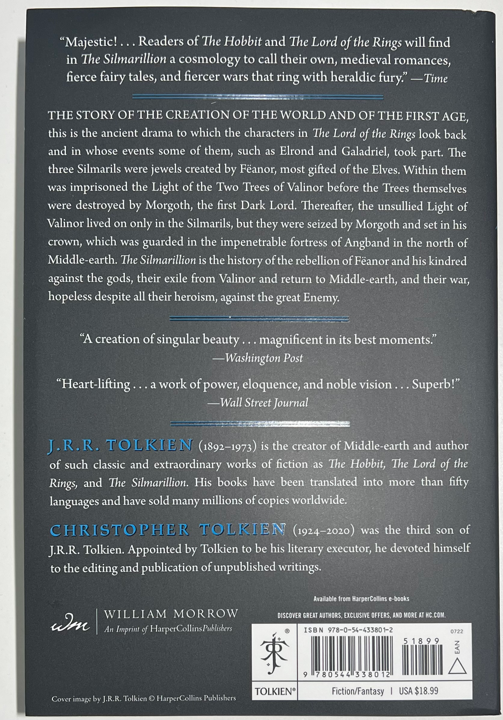 Set primarily in the First Age of Middle-earth, The Silmarillion contains the legend of the creation of the world and an account of the Elder Days. It is the ancient drama remembered by Elrond and Galadriel in The Lord of the Rings, and the harrowing origin of the adventure that ends ages later with Frodo and the One Ring. At the story’s heart are the three Silmarils, jewels that held within them the Light of the Two Trees of Valinor, and Fëanor, the most gifted of elven artificers. When the Two Trees are destroyed, the Silmarils become coveted, setting into motion events that lead to the rebellion of Fëanor and his kindred against the gods, their exile from Valinor, and their hopeless war against the greatest enemy Middle-earth has ever known: Morgoth.